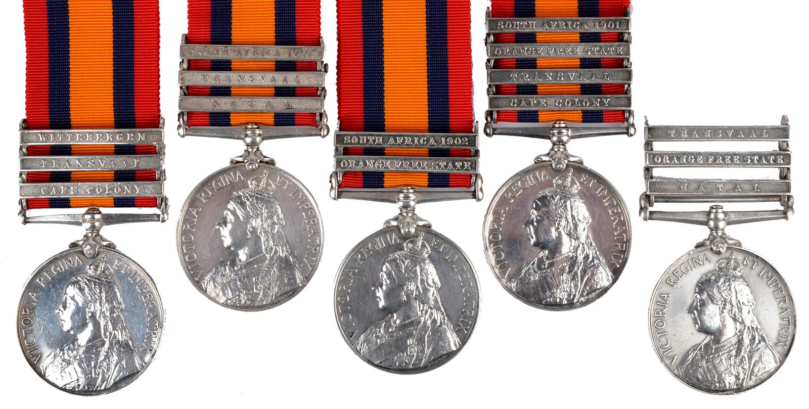 A collection of Queen's South Africa medals: Driver W. Carruthers, Army Service Corps, 1st type reverse, 3 clasps: Natal, Transvaal, South Africa 1901 (9324 DR: W. CARRUTHERS, A.S.C.), faint ghost dates, very fine or better; Private W. Irving, 1st Battalion the Border Regiment, 1st type reverse, 3 clasps: Natal, Orange Free State, Transvaal (5832 PTE W. IRVING, 1ST BORDER REGT), very faint ghost dates, edge bruise below bust, otherwise good very fine; Private W. Swallow, King's Royal Rifle Corps, 2nd type reverse, 2 clasps: Orange Free State, South Africa 1902 (3144 PTE W. SWALLOW. K.R.R.C.), good very fine; Private A.A. Jackson, 19th Company, 6th Battalion, Imperial Yeomanry, 2nd type reverse, four clasps: Cape Colony, Transvaal, Orange Free State, South Africa 1901 (8477 PTE A.A. JACKSON. 19TH COY 6TH IMPL: YEO:), good very fine; and a re-named example, 2nd type reverse, three clasps: Cape Colony, Transvaal, Wittebergen (7008 PTE: A. BERN. 2ND ROYAL HIGHLANDERS.), re-engraved in plain capitals (entitlement confirmed on roll), very fine. [5]
