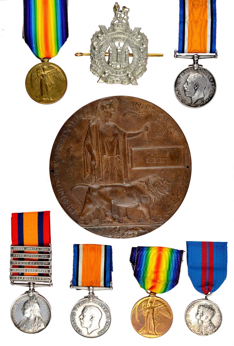 Two part medal groups to Great War casualties: the first to Private Thomas Emerson, 1st Battalion King's Own Scottish Borderers, comprising: British War Medal and Victory Medal (19076 PTE. T. EMERSON. K.O. SCO. BORD.), and Memorial Plaque (THOMAS EMERSON); the second to Sergeant James Jesse Russell, Sussex and Hampshire Regiments, comprising: Queen's South Africa Medal, 2nd reverse, 5 clasps: Cape Colony, Orange Free State, Transvaal, South Africa 1901, South Africa 1902 (8352 PTE J. RUSSELL, RL: SUSSEX REGT); British War Medal and Victory Medals (12097 SJT. J.J. RUSSELL. HAMPS. R.); Coronation Medal 1911; offered with much research and copy documents. Medals all about very fine.