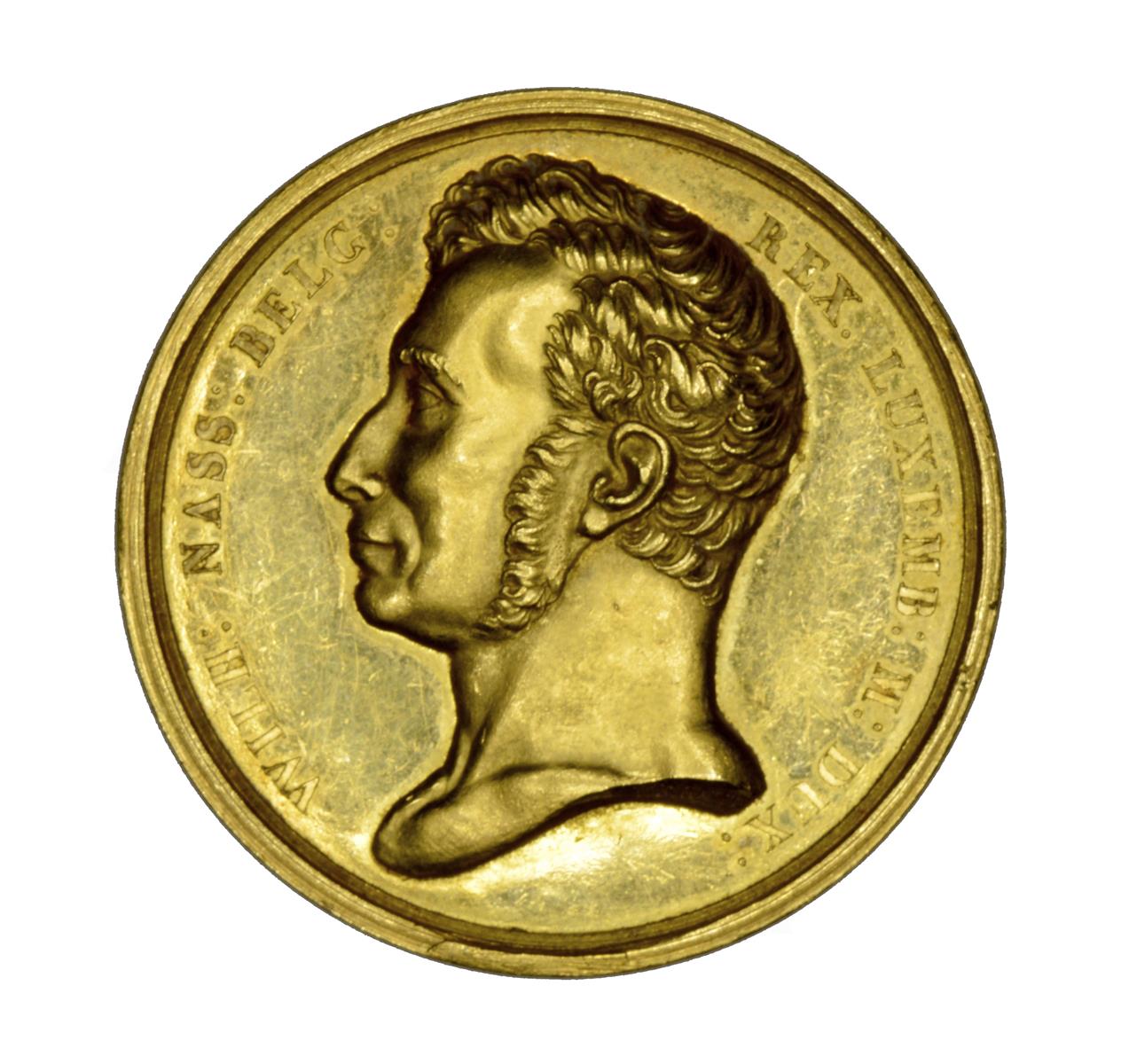 Netherlands: William I (1815-1840), a scarce gold medical reward medal, obverse with the King's bust sinister, legend: WILH: NASS: BELG: REX. LUXEMB: M: DUX:; reverse with impressed dedication within a wreath: S. FOCKEMA MED. DOCTORI LEOVARDIAE DE PROPAGANDA VARIOLARUM VACCINARUM INSITIONE BENE MERITO REX. D. MDCCCXXXIII, indicating that Dr Sybrandius Fockema of Leeuwarden was recognised in 1833 for administering inoculations against (or with) cowpox, 41mm, 28.7 grams.