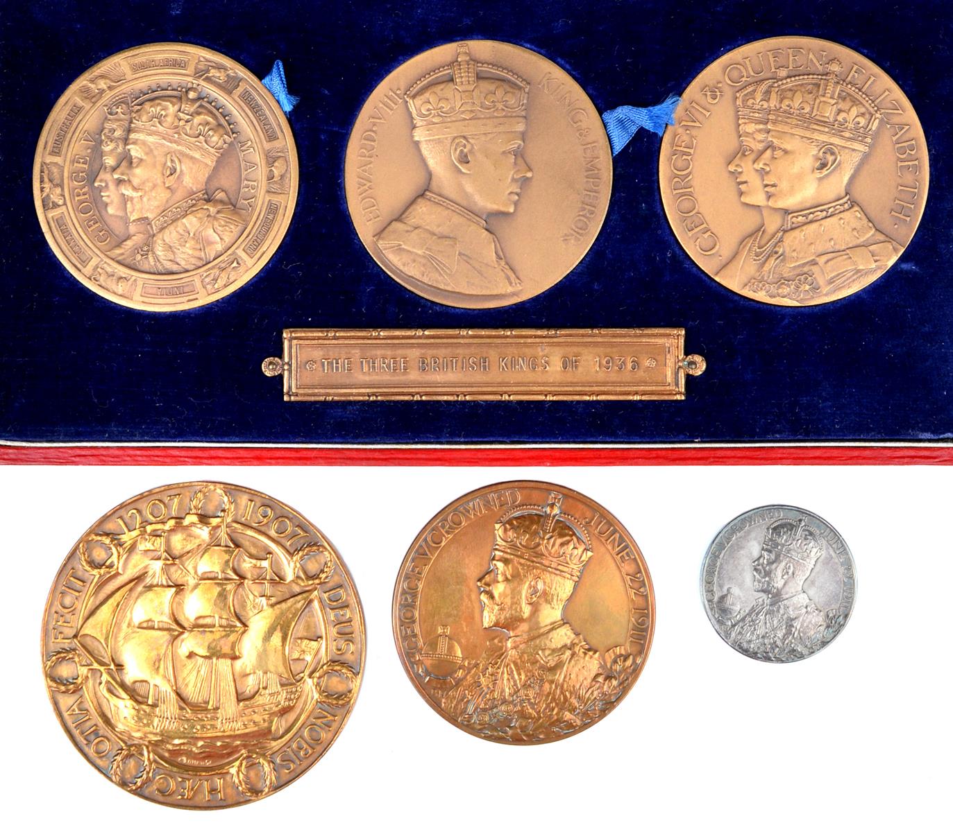 A small collection of medallions, comprising: Liverpool, 700th Anniversary of the Foundation, bronze, 64 mm; Coronation of George V 1911, reverse with bust of Queen Mary, bronze, 51mm; the same type in silver, 31mm; George V, Silver Jubilee 1935, conjoined busts surrounded by Commonwealth countries in panels, reverse with figure of the Mother Country with Commonwealth subjects, bronze, 51mm; Abdication of Edward VIII 1936, bronze, 51 mm; Coronation of George VI 1937; conjoined busts of George VI and Queen Elizabeth, bronze, 51mm (E 1898a; 1922a; 1922b; 2030; 2040a; 2047a). The first three good very fine or better, the last three cased together under the title 'THE THREE BRITISH KINGS OF 1936' and about as struck. [6]