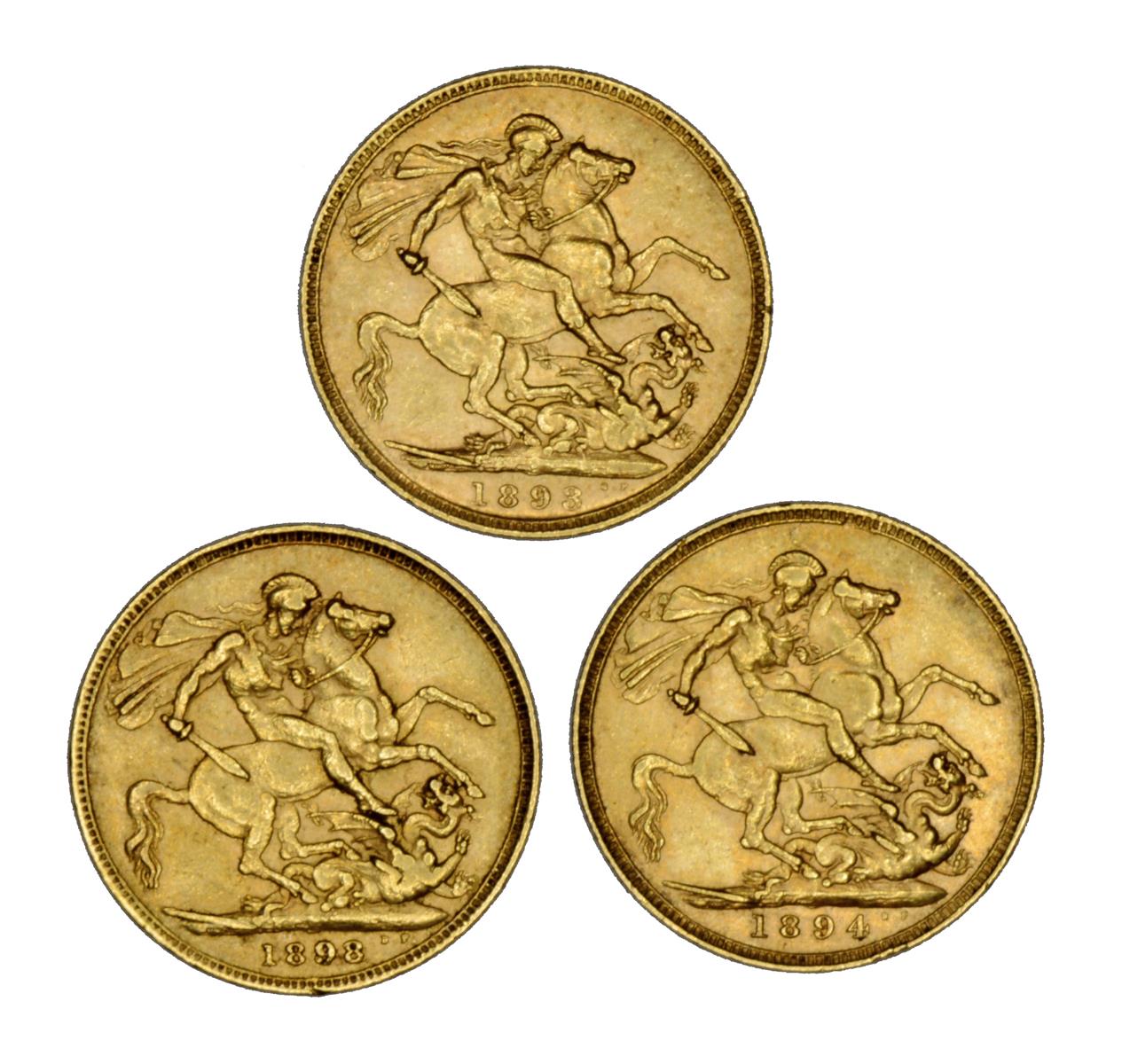 Victoria, gold sovereigns, veiled head: 1893, very fine; 1894, very fine or nearly so; 1898, fine (S 3874). [3]