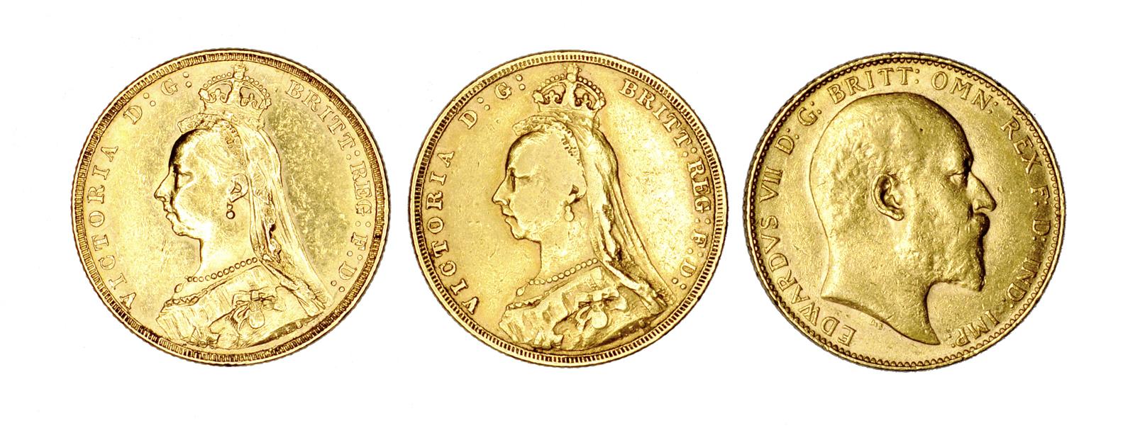 Three gold sovereigns: Victoria, 1887, Melbourne mint (S 3867A), good very fine; 1892 (S 3866C), fine; Edward VII, 1910 (S 3969), very fine or better. [3]