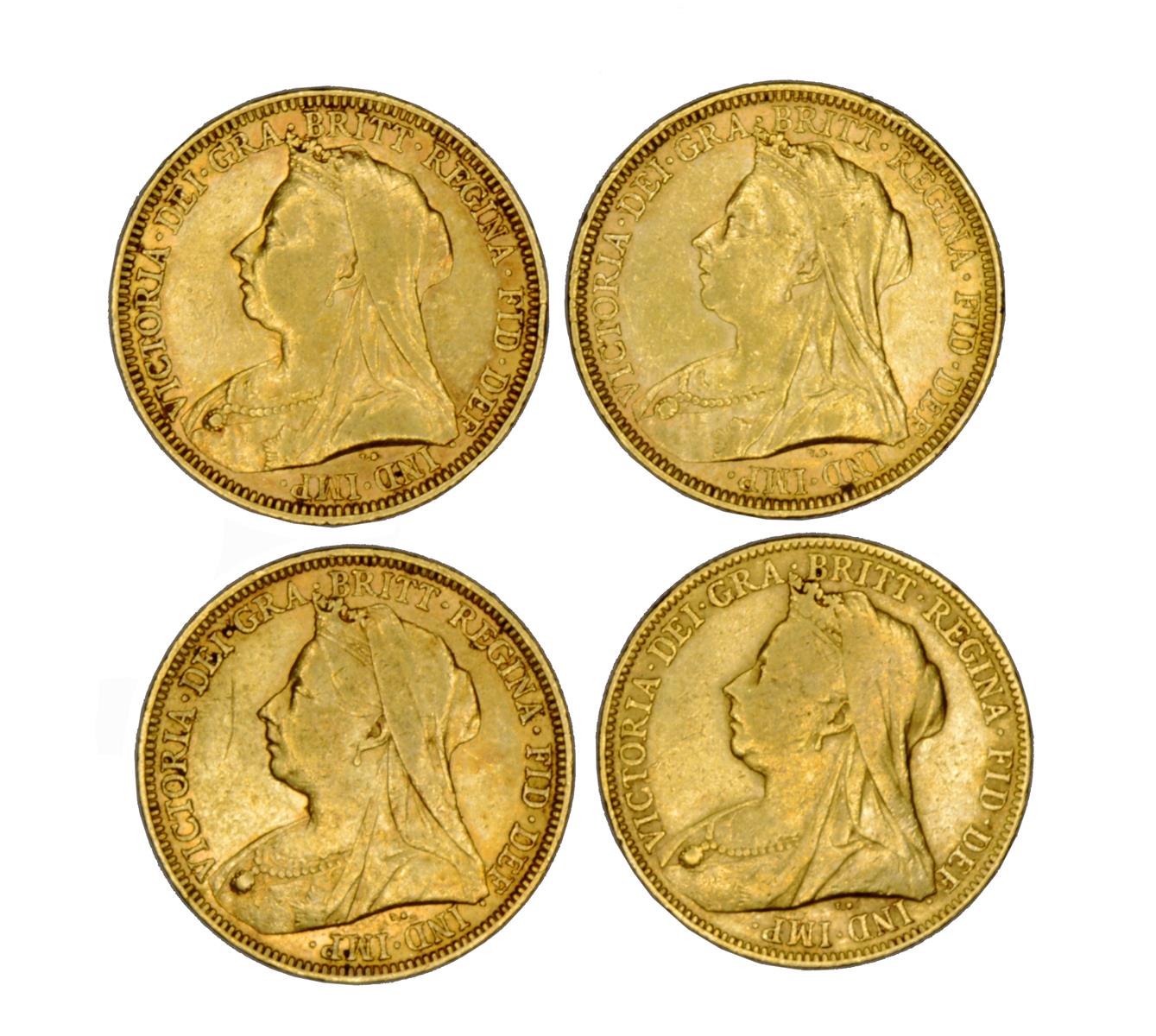 Victoria, gold sovereigns, veiled head: 1894 (2), Melbourne Mint; 1895, Melbourne Mint (S 3875); 1900, Perth Mint (S 3876), Good fine or a little better. [4]