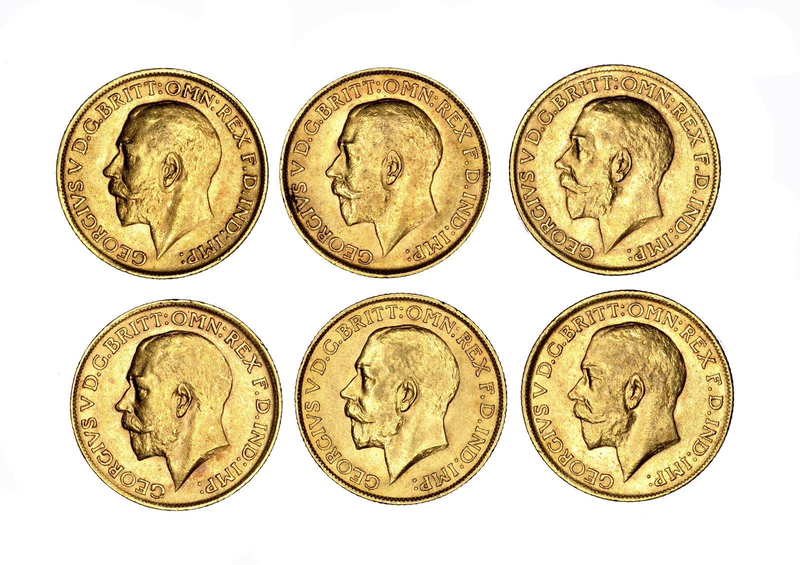 George V, gold sovereigns: 1911 (2), 1912 (4) (S 3996). Conditions vary from good fine to nearly extremely fine. [6]