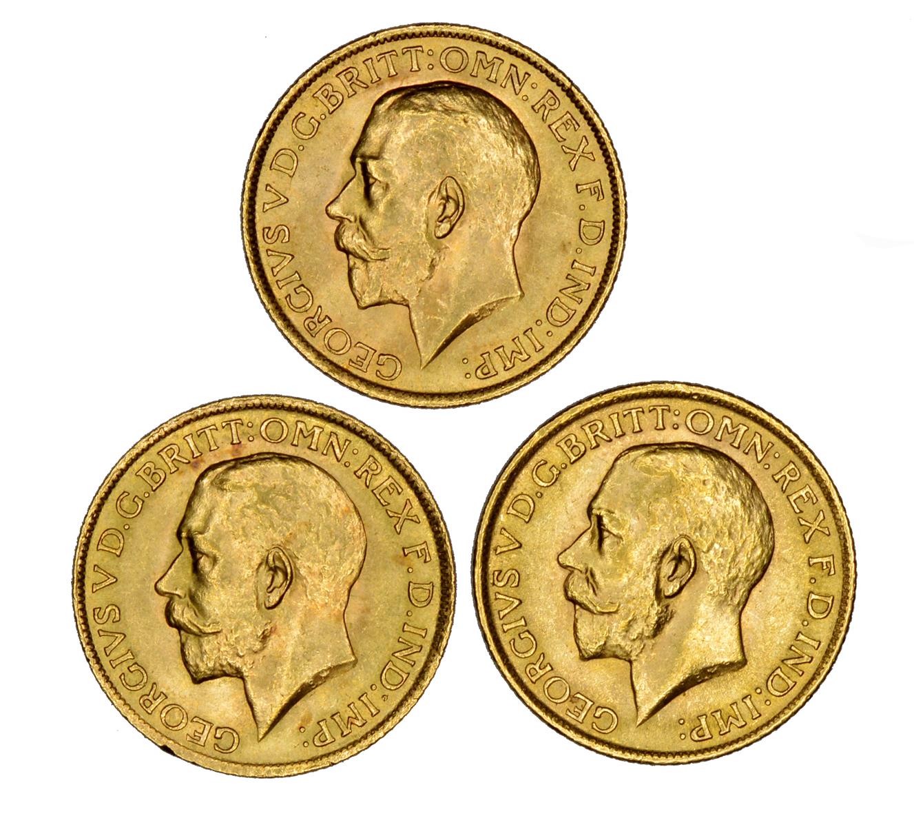 George V, gold sovereigns, 1915 (3) (S 3996). Nearly extremely fine. [3]