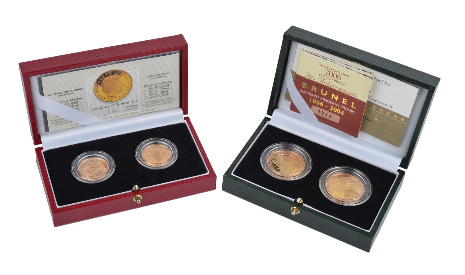 Elizabeth II, gold proof coins: two pounds, 2006, Birth of Brunel (S 4581); two pounds, 2006, Brunel/Paddington Station (S 4582); sovereign, 2000, United Kingdom (S 4430); sovereign, 2000, Jersey; cased in pair by denomination, with Royal Mint Certificates. As struck