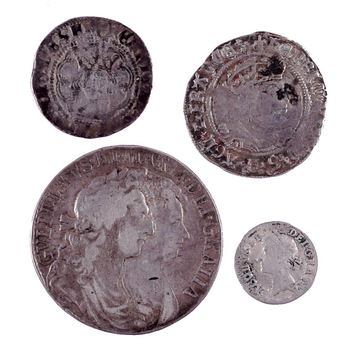 England, four silver coins: Henry VI, half groat, annulet issue (1422-30), Calais mint, annulets to neck, r. annulets to two quarters of cross (S 1840), near very fine; Henry VIII, groat, second coinage (1526-44), mm. lis, r. saltires to cross ends (S 2337E), fine or better; James II, two pence, 1686 (S 3416), about fine; William and Mary (1689-94), half crown, 1689, first reverse (S 3434), near fine. [4]