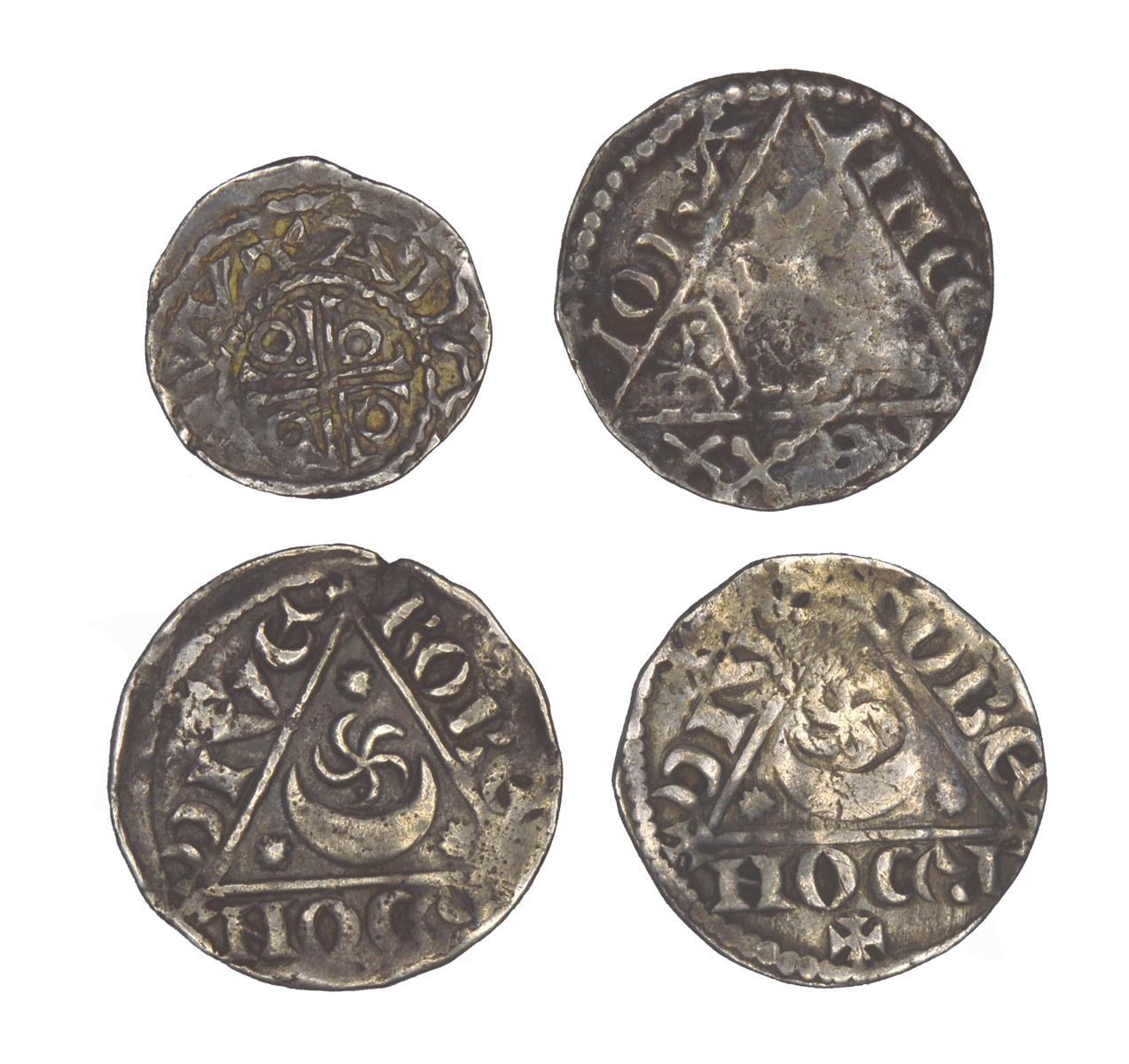 Ireland, John, four silver coins: 2nd coinage (as Prince): halfpenny, Dublin, reverse with voided cross potent, moneyer: Adam (S 6205), good fine; 3rd coinage (as King): pennies (2), Dublin, moneyer: Roberd (S 6228), near fine and near very fine; penny, Limerick, Moneyer: Willem (S 6229), near fine. [4]