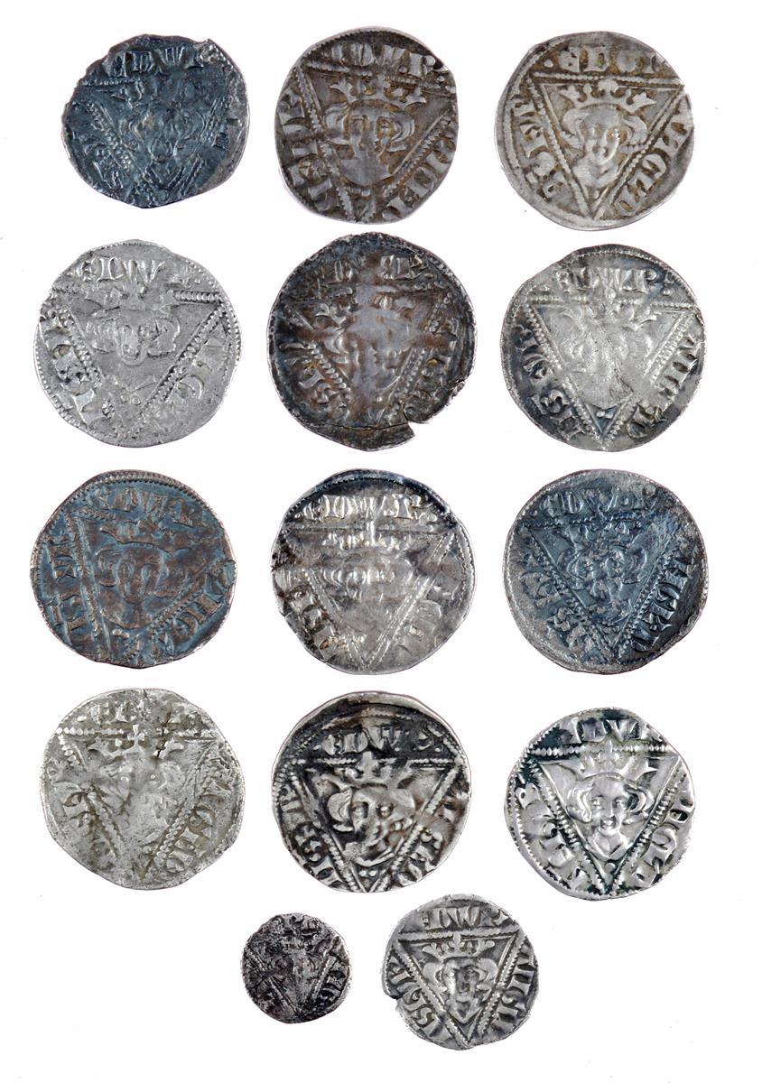 Ireland, Edward I, a collection of silver coins comprising: 2nd coinage (1279-1302), early issues: pennies (4), Dublin, pellet before EDW.R, one fine, the other good very fine or better; pennies (5), Waterford, one near fine, the others near very fine or better; halfpenny, Waterford, no pellet before EDW R, fine or better; farthing, Waterford, fine; 2nd Coinage, late issues: pennies (2), Dublin, both very fine or nearly so; penny, Dublin, pellet before EDW.R, good fine or better. [14]