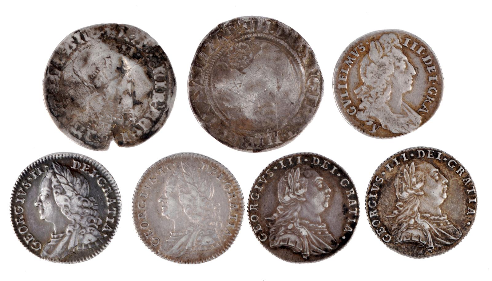 A collection of English silver coins, comprising: Mary, groat, poor; Elizabeth I , sixpence, 1561, fair only; William III, sixpence, 1696, York mint, early harp (S 3525), near fine; George II, sixpences (2), 1757 and 1758 old bust, plain angles (S 3711), good fine or better; George III, sixpences (2), 1787, no semee of hearts (S 3748) , very fine or a little better. [7]
