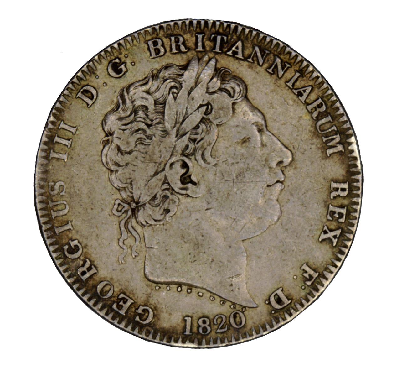 George III, silver crowns: 1820 (2) (S 3787), one fine the other fair; Victoria, silver crowns: 1889 (2) (S 3921), fine; George IV, silver shilling, 1826 (S 3812), near fine. [5]