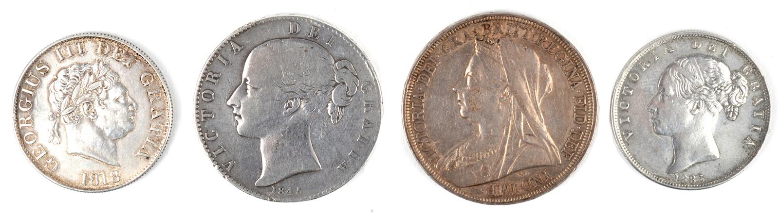 A collection of silver coins, comprising: George III: halfcrown, 1818, small head, near very fine; Victoria, young head coinage: crown, 1845, ciquefoil stops, near fine; halfcrown, 1883, good very fine; Victoria, Jubilee coinage: crowns, 1887 (2), nearly extremely fine and good very fine; double florin, 1887, Roman I, extremely fine or nearly so; double florin, 1887, Arabic 1, good very fine or better; halfcrowns, 1887 (2), about extremely fine; shillings, 1887 (2), small head, extremely fine and nearly so; sixpence, 1891, near very fine; threepence, 1888, extremely fine; Victoria, old head coinage: crown, 1897, edge LXI, very fine; halfcrown, 1901, extremely fine; threepence, 1900, about extremely fine. [16]