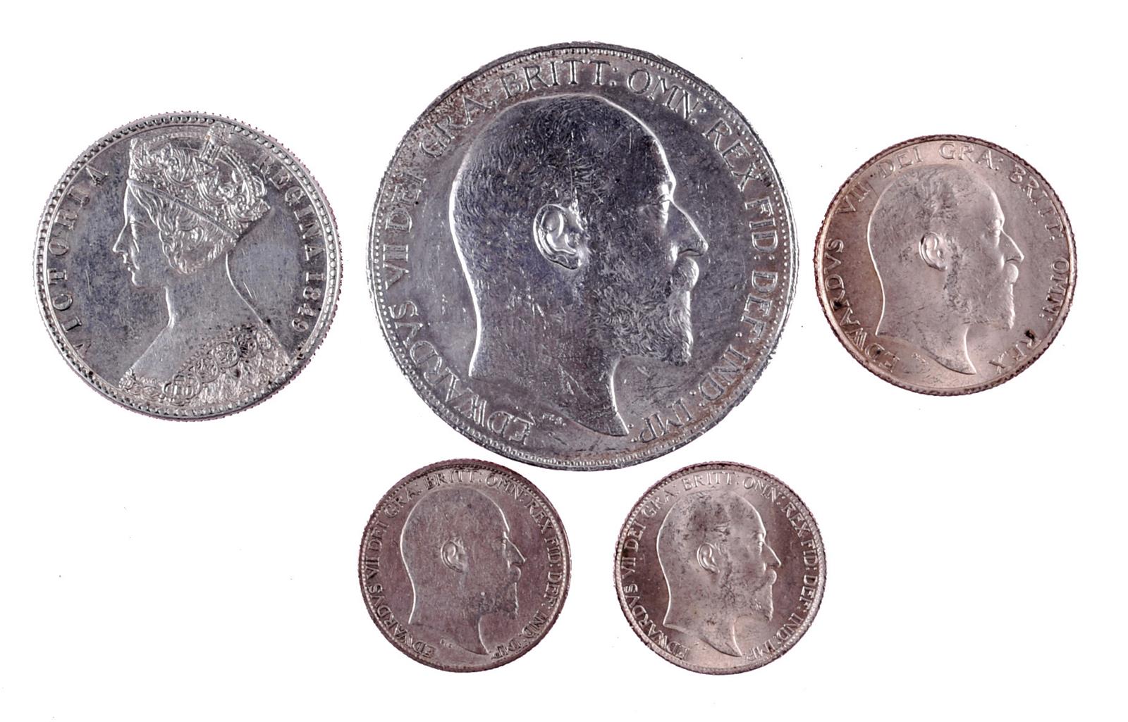 Five silver coins: Victoria, florin, 1849, 'Godless' type (S 3890), die cracks, good very fine or better; Edward VII: crown, 1902 (S 3978), good very fine or better; shilling, 1902 (S 3982), extremely fine; sixpences (2), 1903 and 1904 (S 3983), extremely fine and good very fine. [5]