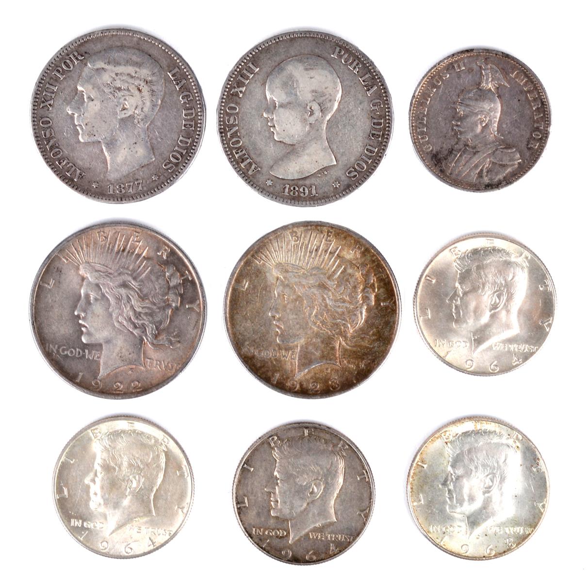 A collection of coins comprising: U.S.A.: dollars, Morgan type, 1922, 1923, both good fine; half dollars, John F. Kennedy, 1964 (3), two about extremely fine, one very fine, 1968, nearly extremely fine; Spain: Alphonso XII, 5 pesetas, 1877, fine; Alphonso XIII, 5 pesetas 1891, fine; German East Africa, rupie, 1910 very fine. [9]