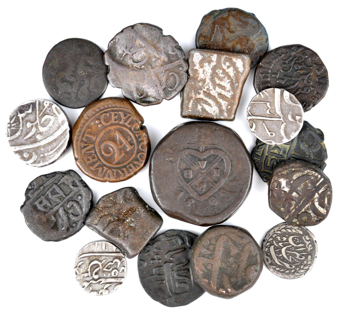 A small collection of Indian coins, including: Honourable East India Company, Bombay Presidency, copper four piece, 1803 (KM 201), about fine; Mysore, copper twenty cash, 1841 (C 193.2), good fine; Ceylon, British colony, 1/24 rixdollar, 1803 (KM 67), fine; silver rupee, half rupee and quarter rupee, good very fine; and various others. [17]