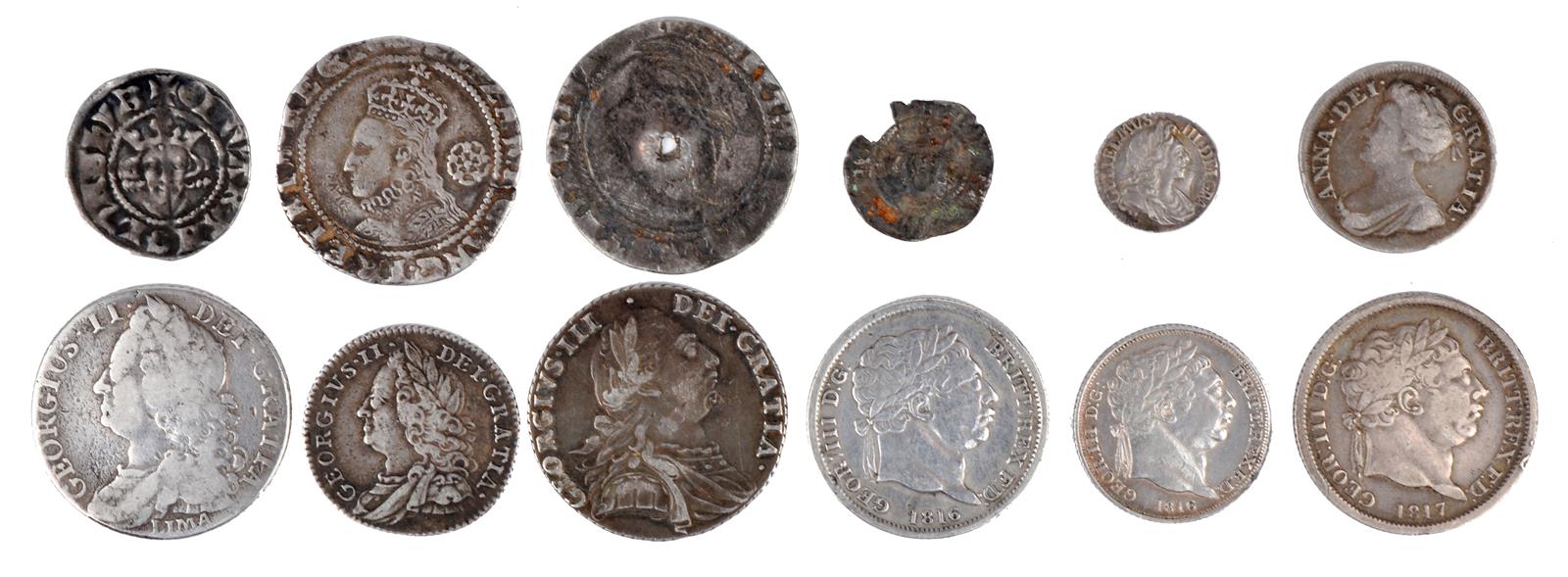 A small collection of British silver coins, comprising: George II, shilling, 1745, Lima (S 3703), near fine; George III, shilling, 1787, semee of hearts, bust with countermark to chin (S 3746), very fine or nearly so; shiillings (2), 1816 and 1817 (S 3790), near very fine; Elizabeth I, sixpence, 1591, mintmark indistinct, otherwise near very fine; George II, sixpence, 1758, plain angles (S 3711), very fine; George III, sixpence, 1816 (S 3791), very fine; Anne, fourpence, 1710 (S 3595B), fine; Edward III, penny, Canterbury mint, fine; William III, penny, 1698 (S 3552), very fine; and two hammered coins, details indistinct. [12]