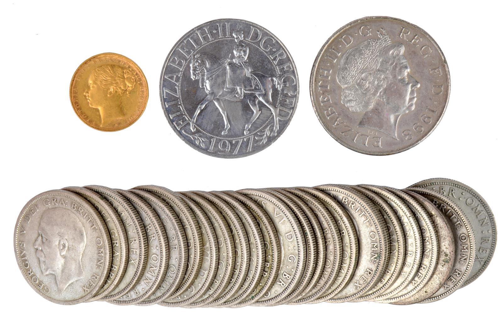 A small collection of coins and associated items, including: Victoria: gold sovereign, 1884, Melbourne mint (S 3857B), good very fine; a cased set of twelve silver ingots 'The Royal Arms', commemorating the 1977 Silver Jubilee, with explanatory cards; and a small quantity of British debased silver and cupro-nickel commemorative issues.