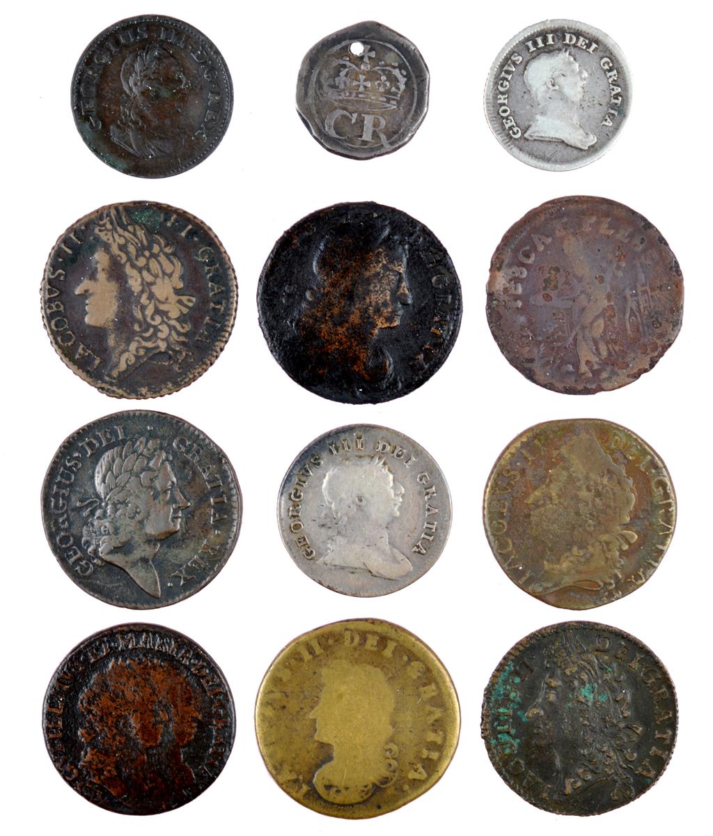 A small collection of Anglo-Irish coins, comprising: Charles I, silver 'Ormond' groat (S 6548), pierced near edge, otherwise good fine or better; James II, two 'gunmoney' shillings, large size, March 1689 and April 1690 (S 6581O, 6581Q), each near very fine; and a collection of other Stuart, Orange and Hanoverian issues in worn condition (S 6569, 6575, 6581K, 6594, 6597, 6601, 6617, 6619, 6622). [12]