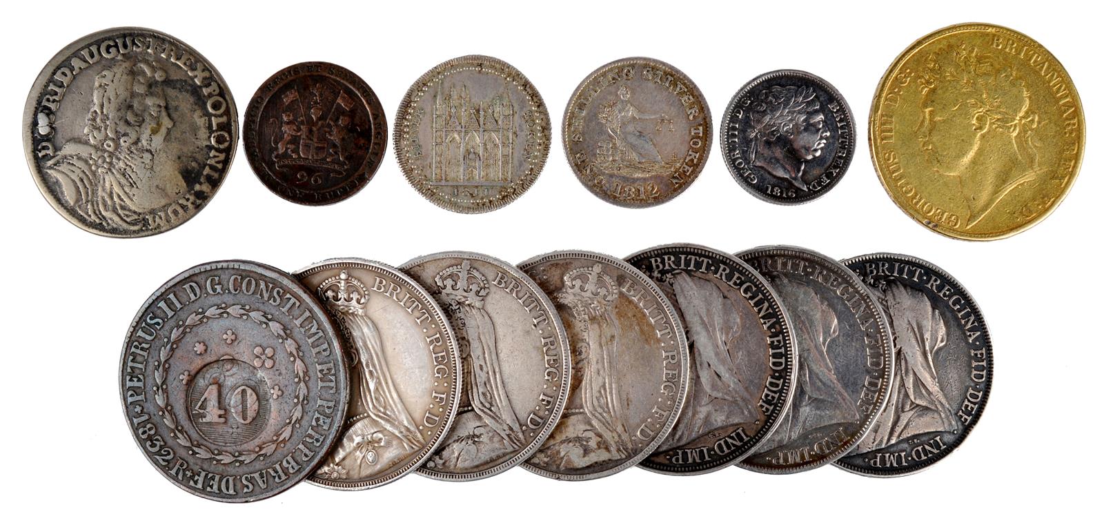 A small quantity of tokens and coins, including: Peterborough, silver eighteen pence bank token, 1811, Cole & Co., about very fine; Stockport, silver shilling token, 1812, I. Cartwright & G & R Fearns, beehive, good very fine; George IV and Victoria, seven silver crowns, dates from 1812 to 1898, 1812 gilt and very poor, others fine to very fine; George III, silver shilling, 1816 (S 3790), very fine; and three others. [13]
