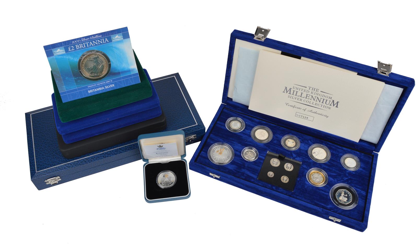 Elizabeth II, a collection of silver and Britannia silver proof coins, all cased with certificates and some in official sets, comprising: 2000, The Millenium Collection (13 coins), two pounds to one penny and maundy set (PSS 08); 2006, The Queen's 80th Birthday Collection (13 coins), two pounds to one penny and maundy set (PSS 22); 2000, Queen Mother Centenary piedfort crown (S 4553); 2003, piedfort one pound, DNA two pounds and Suffragette fifty pence, cased together (S 4590, 4577, 4614); 2005, two piedfort five pound coins, Horatio Nelson and Trafalgar (PSS 16); 2004, Britannia silver two pound, in card and plastic blister pack (S 4500); 1997, Barbados one dollar, Golden Wedding Anniversary; 2002, Channel Islands five pounds (3 coin set), Duke of Wellington; 2005, Channel Islands, five pounds (3 coin set with dress miniature medal), The Crimean War. Some mild patination and speckling in a few cases (notably PSS 22), otherwise about as struck.