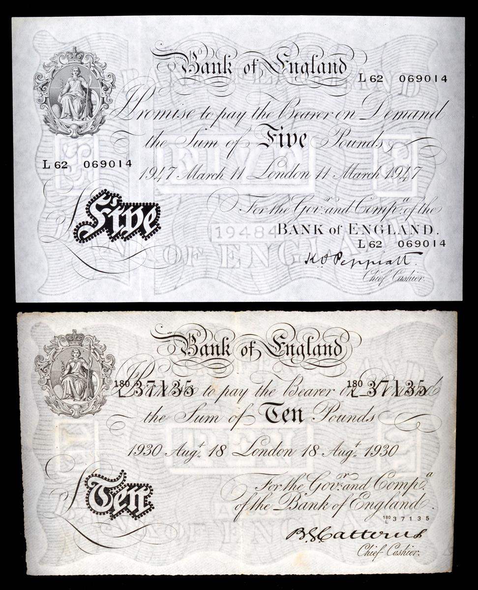 Great Britain: a collection of white five and ten pound notes: five pounds: Peppiatt, 14th March 1945; Peppiatt, 11th March 1947; Beace, 22nd July 1950, 7th April 1952; O'Brien, 6th February 1956, 10th September 1956; ten pounds: Catterus, 18th August 1930; Peppiatt, 19th November 1936; together with an Operation Bernhard forgery five pound note, 23rd November 1935. grades vary but mainly very high. [9]