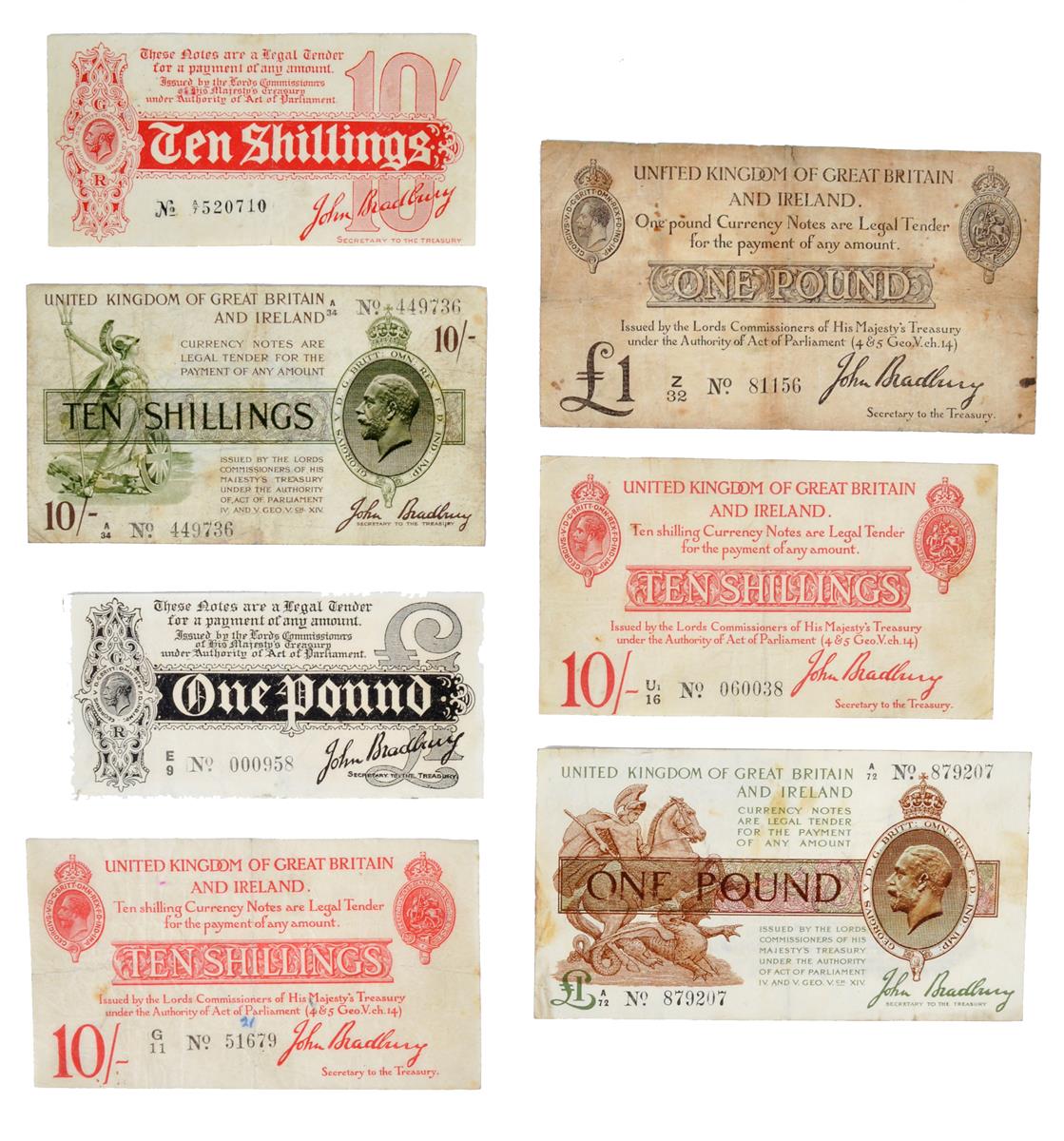 Great Britain: a collection of one pound and ten shilling notes, all John Bradbury, including: ten shillings:1st Issue 1914, 2nd issue 1914; one pound: 1st issue 1914, 3rd issue 1917. Various grades, mainly high. [7]