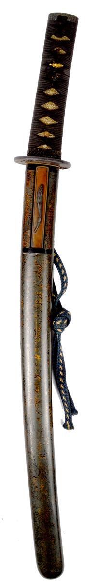 A Japanese sword (wakizashi), blade 17 in., shinogi-zukuri, midare hamon, mumei, gilt copper habaki with slanting file marks and raised grains, iron tsuba with applied foliate and pierced with a trellis design, fuchi and kashira relief decorated with bark effect, gold and shakudo menuki representing sprays of foliage, saya lacquered with swirling abstract effect, kogatana with characters engraved to the blade - the kozuka decorated with an applied ear of sorgum.