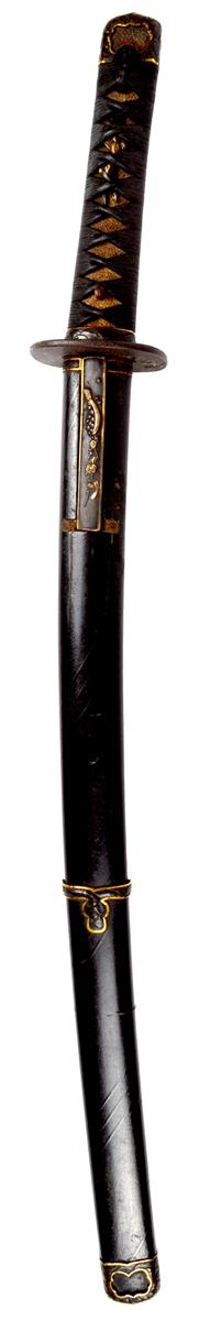 A Japanese sword (o-wakizashi), blade 21 in., shinogi-zukuri with single hi, hamon is gunome midare becoming suguha towards the nakago, ubu-nakago with two character mei (kane tsune) enraved in a style suggesting a gendaito, plain silvered habaki, iron tsuba with applied silver kylin and mixed metal foliage, tsuka with gilt highlighted shakudo mountings comprising fuchi and kabutogane kashira with waves in relief, and menuki in the form of birds in flight, lacquered saya with subtle pattern of spiral bands and mounted en suite to the tsuka, kogatana with character engraved on the blade and with gilt and shakudo kozuka adorned with clams in a reed basket.