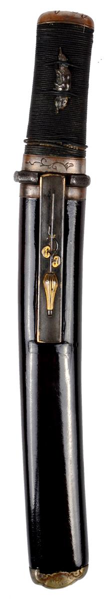 A Japanese dagger (tanto), blade 8.5 in., o-no-kubi-zukuri, copper habaki, cord wrapped grip with single menuki involving a horse, saya with associated kogatana.