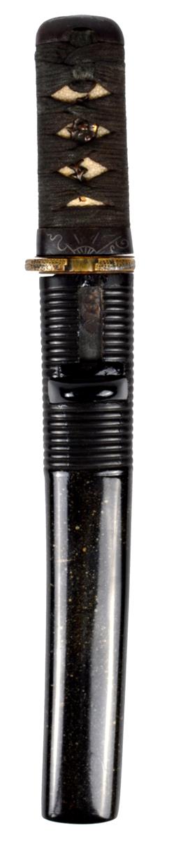 A Japanese dagger (tanto), blade 8 in., hira-zukuri, copper habaki, iron fuchi and kashira, laquered saya with ribbed top.
