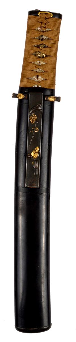 A Japanese dagger (tanto), blade 8 in., hira-zukuri with undulating hamon and distinct boshi, silvered habaki with nekogaki, shakudo tsuba with applied leaves to a nanako ground, matching fuchi and kashira depicting musical instruments or toys, paired menuki in the form of rats, plain laquered saya, associated kogatana with kozuka adapted from cutlery and depicting a sword maker.