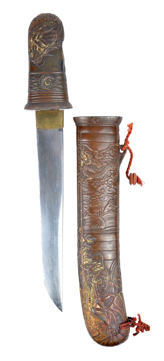 A Japanese dagger (aikuchi tanto), plain steel blade 6.5 in., hira-zukuri; brass habaki; copper plated mounting with detailed relief decoration of shellfish including lobsters enveloping the ends of the hilt and scabbard.