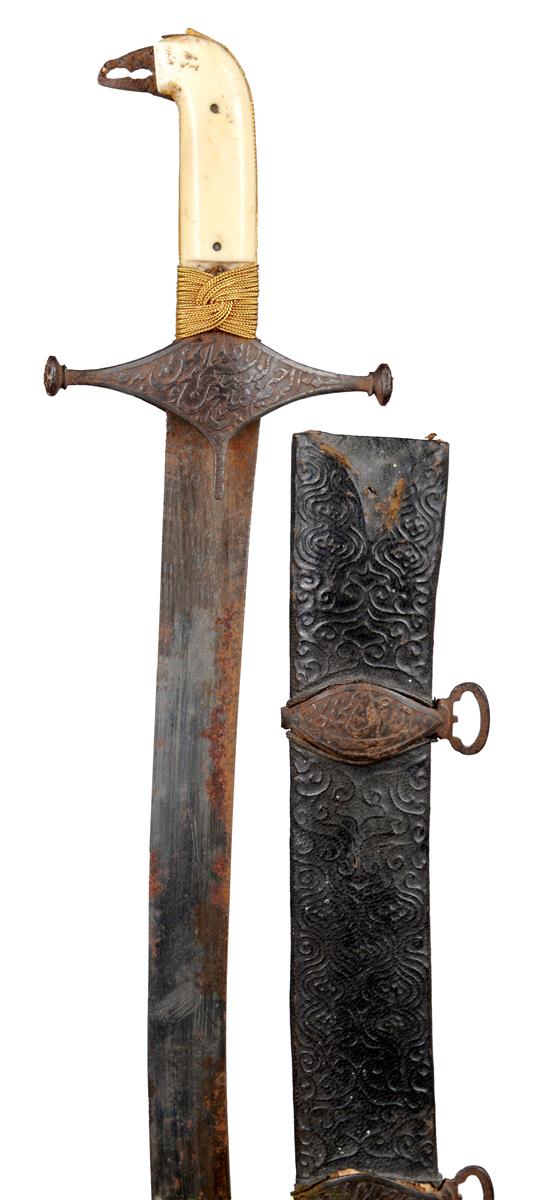 λ A Persian sword (shamshir), curved blade 28 in., iron hilt with Arabic script in relief to the ecousson and rosette terminal quillons, collar of braided gold wire, the frame covered with sheet gold, ivory grip scales, lacking pommel; leather scabbard with moulded scrolling decoration and two iron bands with arabic script en suite to the hilt, gold repousse decorated chape, late 18th or 19th Century.