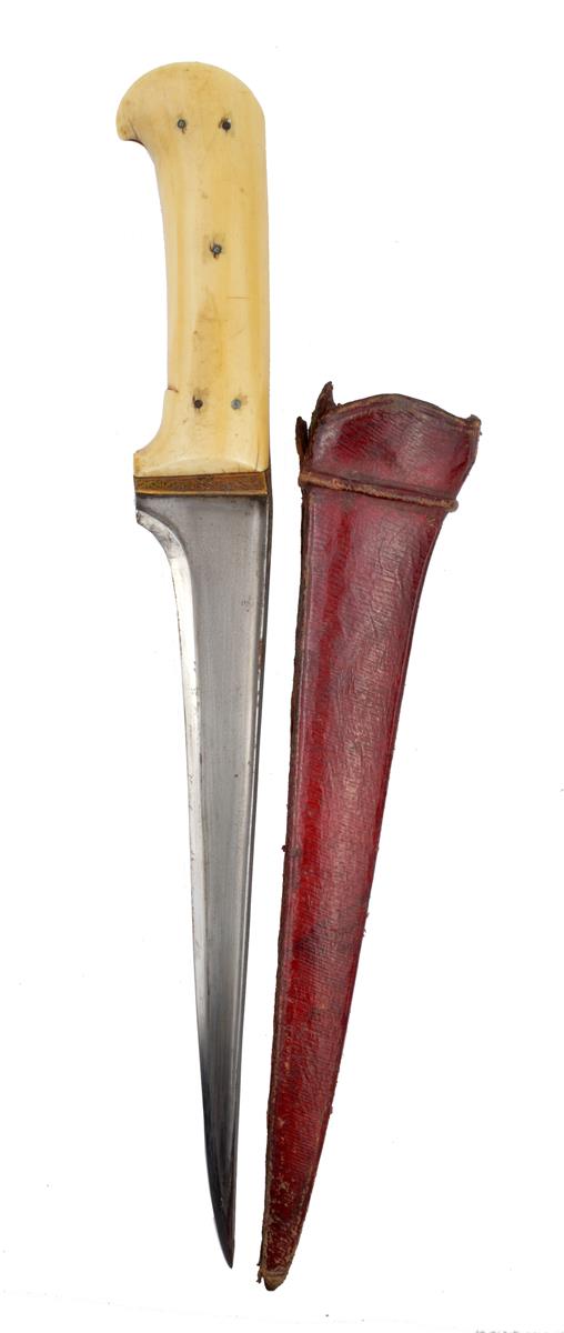 λ A good Indian dagger (peshkabz), watered steel T-section blade 9 in., the frame of the hilt decorated with gold koftgari, ivory grip scales, red leather scabbard with moulded top enclosing the base of the hilt, late 18th or 19th Century.