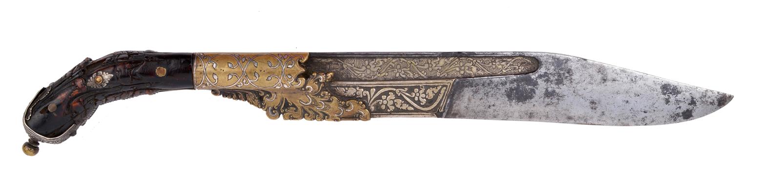 λ A good Sinhalese knife (piha-kaetta), heavy clip-backed blade 9 in., back fuller and upper part of blade overlaid with incised and repousse decorated white metal, two-stage hilt with brass collar inlaid in silver and extending in scrolls to cover part of the blade, white metal mounted horn grip.