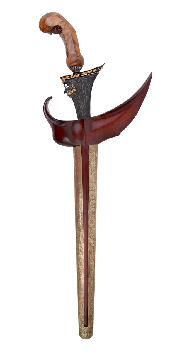 A Indonesian dagger (kris), blade 13 in. slightly flamboyant and with gold inlay to the top, Javanese type faceted hilt with discreet areas of carved detail, boat shaped wrangka, metal covered pendok with incised decoration.