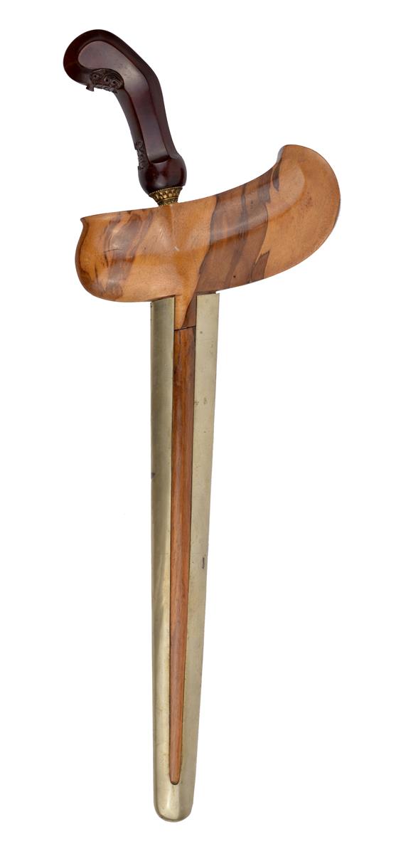 An Indonesian dagger (kris), straight blade 13.5 in. and slightly swollen at the centre, wooden hilt of Javanese type, gilt metal mendak, rounded wranka and metal clad pendok.