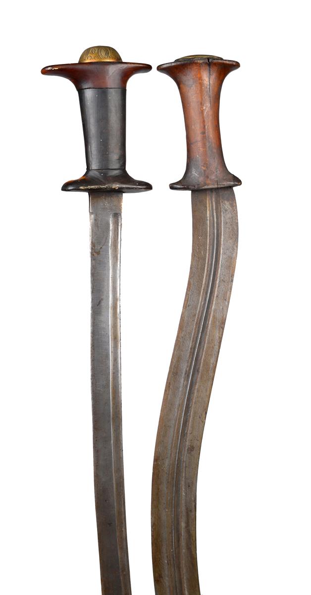 λ An Abyssinian sword (shotel), the re-curved double-edged blade 30 in., central fuller with narrow medial ridge, waisted wooden hilt with brass disc to the pommel; together with another similar sword, European style back fullered blade 35 in., hilt with flaring horn collar and pommel, wooden grip, domed brass pommel, both lacking scabbard, 19th Century. [2]