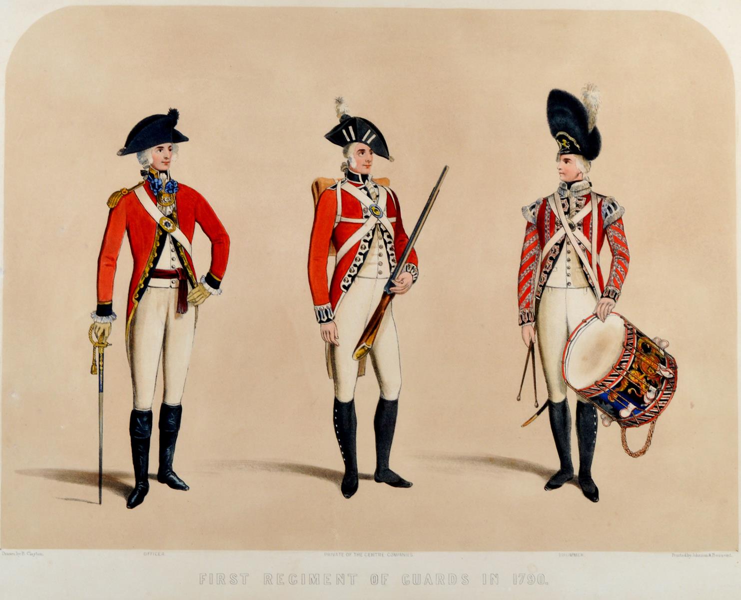 Ten prints of military subjects, including: after B. Clayton, 'First Regiment of Guards in 1790', hand coloured engraving; 'Fifth Foot or Northumberland Fusiliers 1837', hand coloured engraving; 'St Pancras Volunteer/ Prime & Load', illustrating a stage in musket drill, aquatint; the Regimental Colours of the King's Own Royal Regiment, over-painted print, signed H.F. Burke (Sir Henry Farnham Burke, Garter King of Arms and Inspector of Regimental Colours), dated 22nd September 1924; two Baxter Prints: 'Review of the British Fleet at Portsmouth' and 'Charge of the British Troops on the road to Windlesham'; and four others. [10]