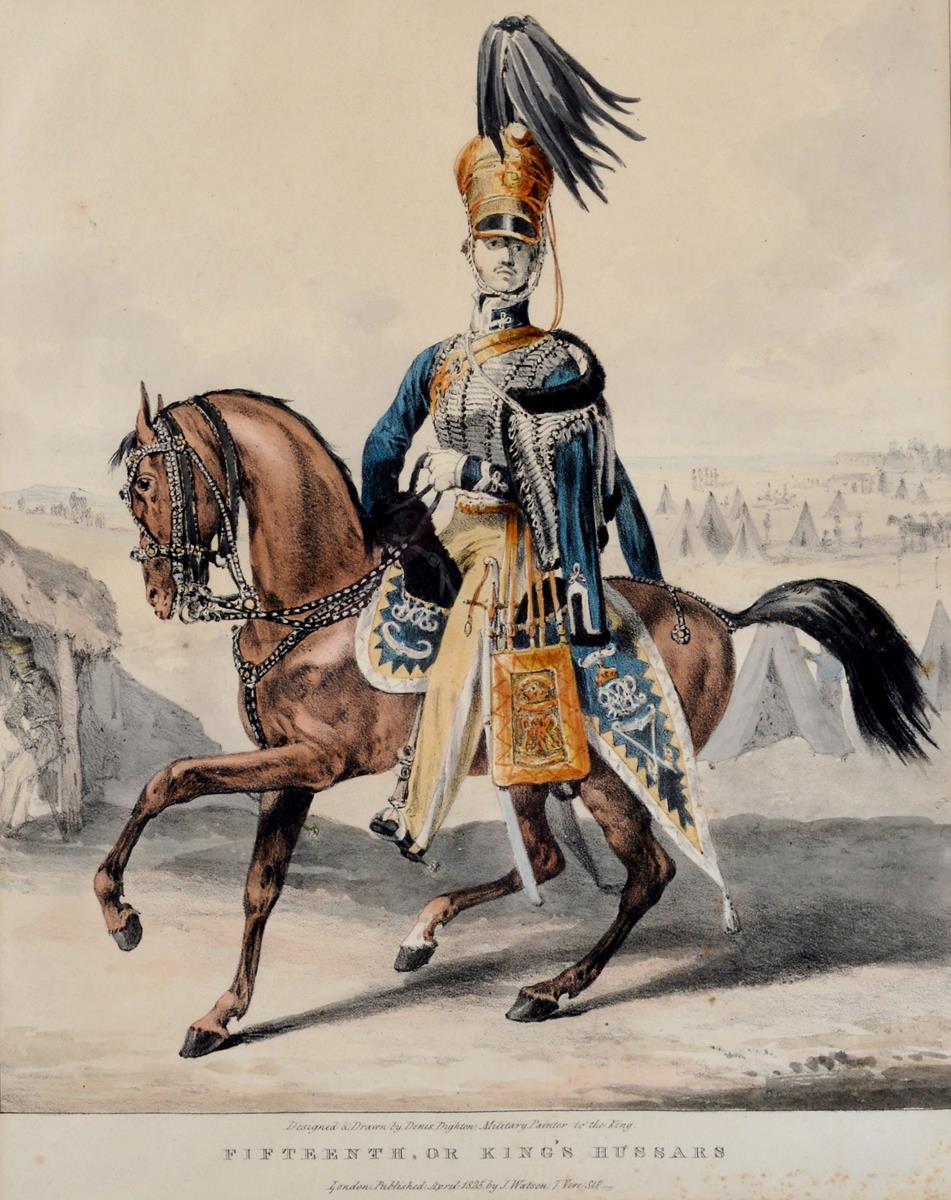 15th Hussars: a collection coloured of prints, comprising six 19th Century examples and one 20th Century, equestrian portraits of officers and privates, mainly in review but in once case at the gallop. [7]