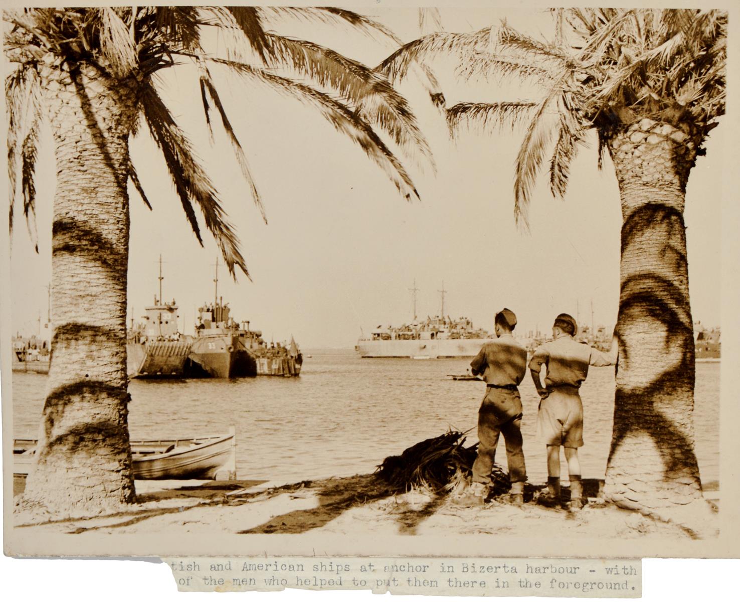 Twelve Second World War press photographs, each with typed caption pasted to the back, and including: 'Harvest Time at Sandringham', which shows the Queen in her carriage with King George VI and Princesses Elizabeth and Margaret following on bicycles, as they inspect the harvest; a study of Chinese soldiers in trenches, holding the line against the Japanese on the Salween Front; and 'An Airman's Grave on Guadalcanal'.