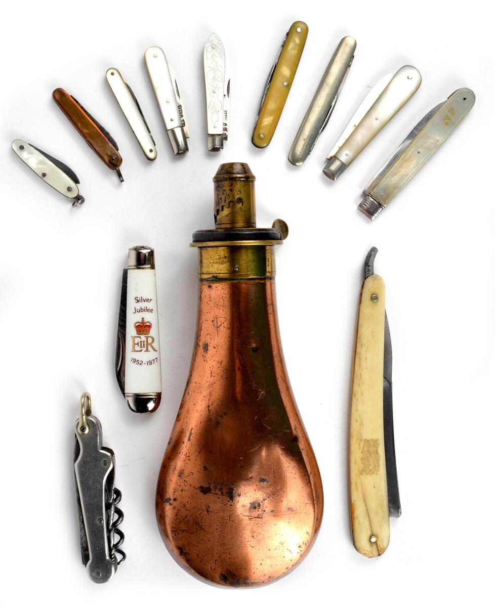A small collection of clasp knives, and similar items, together with a copper powder flask.