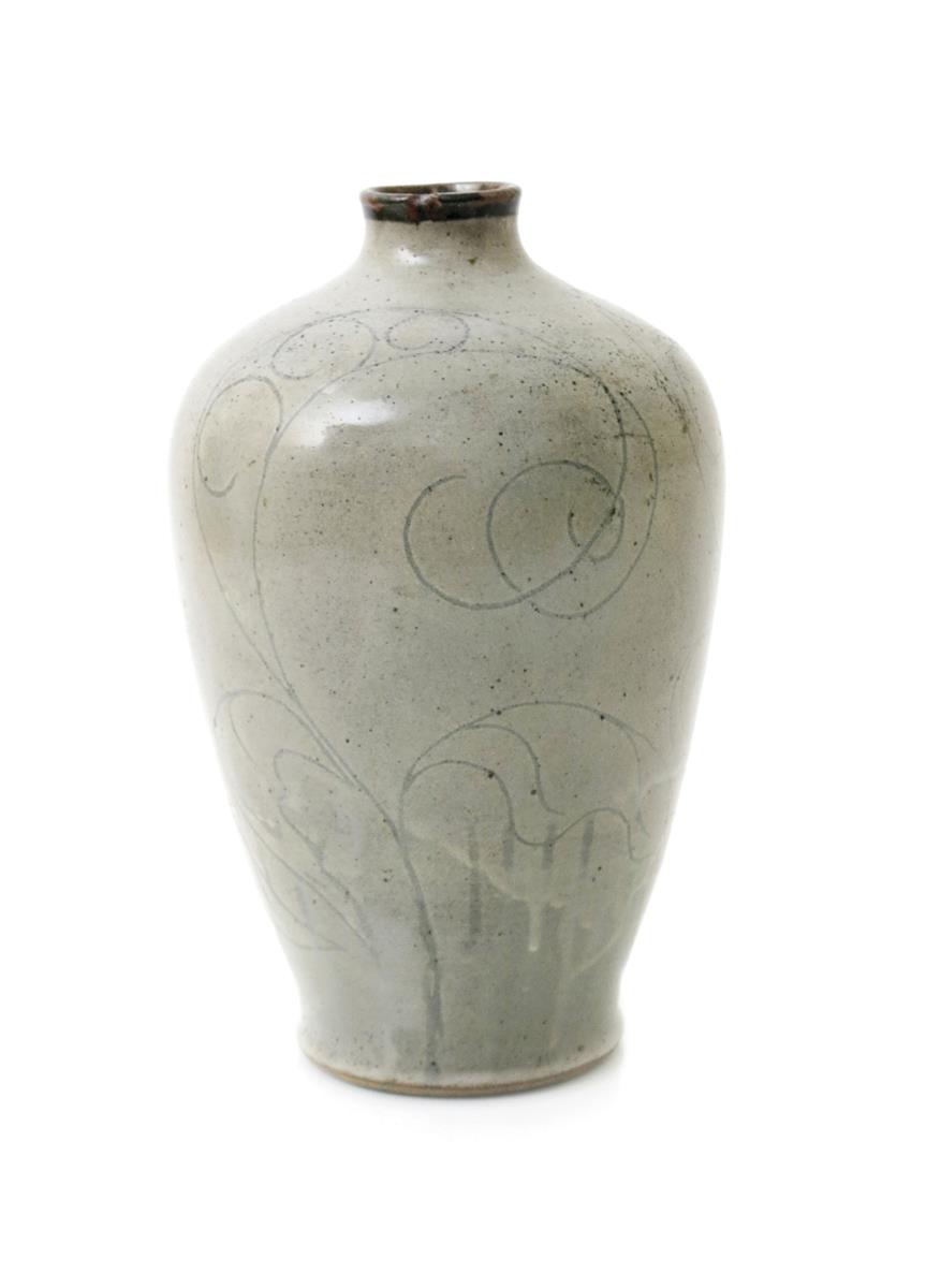 a stoneware vase, shouldered, flaring cylindrical form with narrow neck, glazed to the foot with a grey pitted glaze with simple drawn blue fine swirling foliate design, the top rim with tenmoku band impressed seal mark to base, incised DSM, 34cm. high