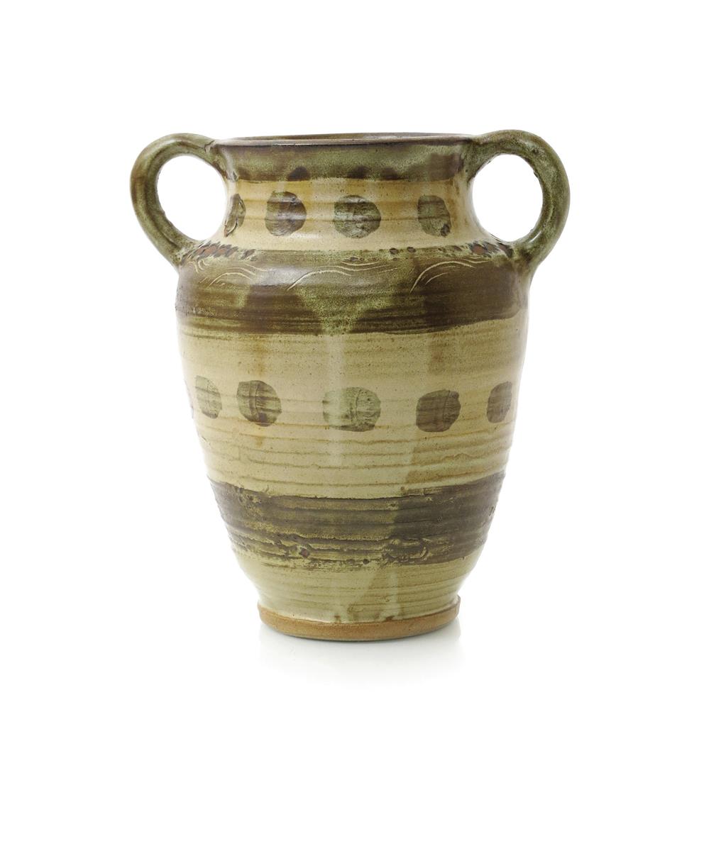 Aulos, a rare stoneware twin-handled vase, shouldered form, painted with alternate bands of beige, brown and green, with circle motif, with incised decoration to the shoulder, impressed seal mark, painted MA2, museum repair to one handle, 27.5cm. high
