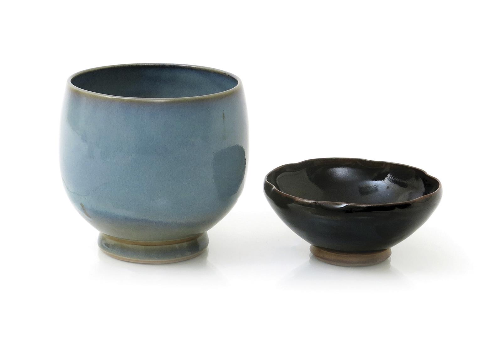 a stoneware footed vase, slightly swollen form, covered to the foot with a running blue fine hare's fur Jun glaze, and another stoneware Lotus bowl by Charles Vyse covered in a tenmoku glaze, incised C Vyse Chelsea, 12cm. high, (2)