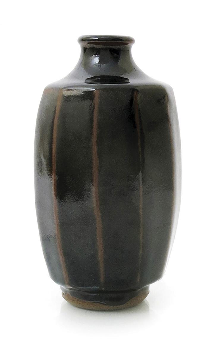 an Avoncroft cut-sided stoneware bottle vase, covered to the foot in a rich tenmoku glaze, seal marks flooded with glaze, 22cm. high