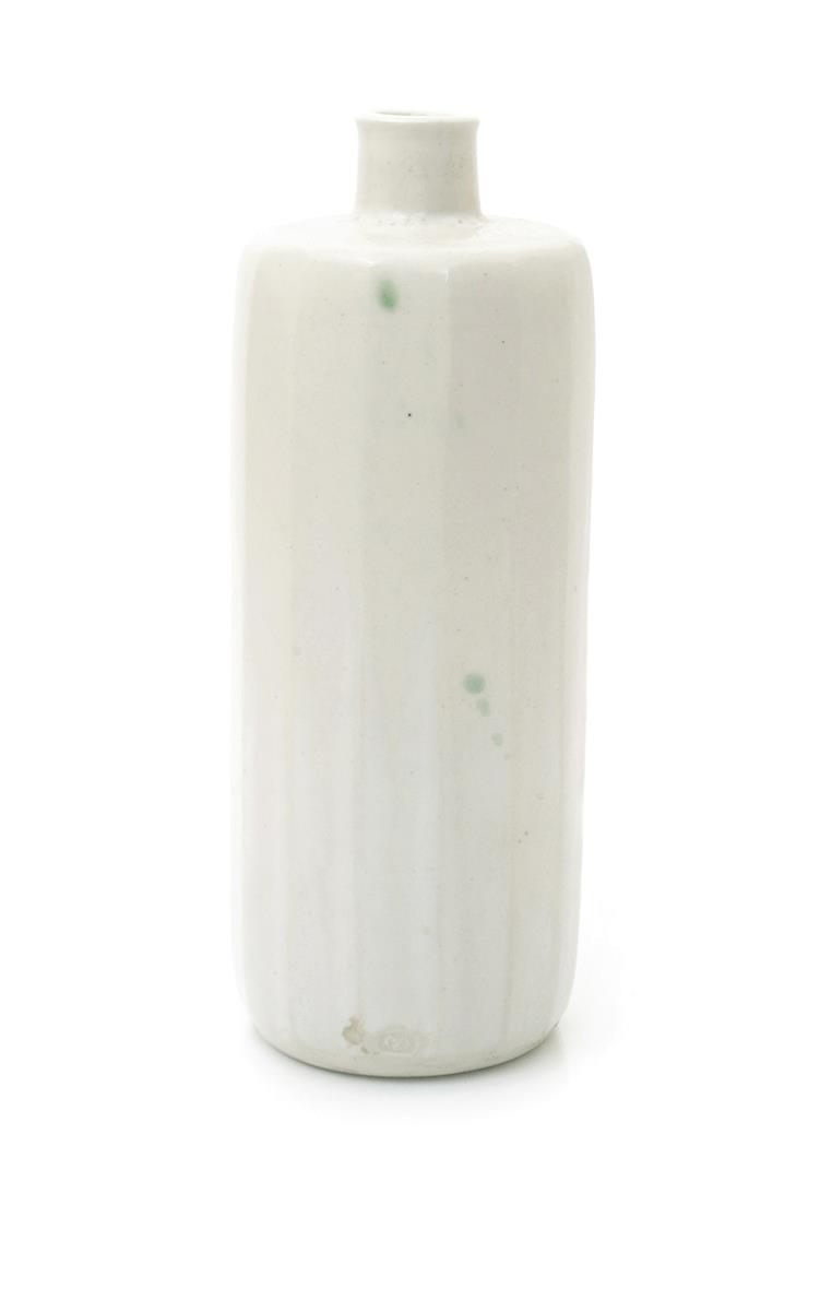 a slender cut-sided stoneware bottle vase, covered to the foot with a white glaze, brushed with pale green impressed seal mark to side, 29cm. high