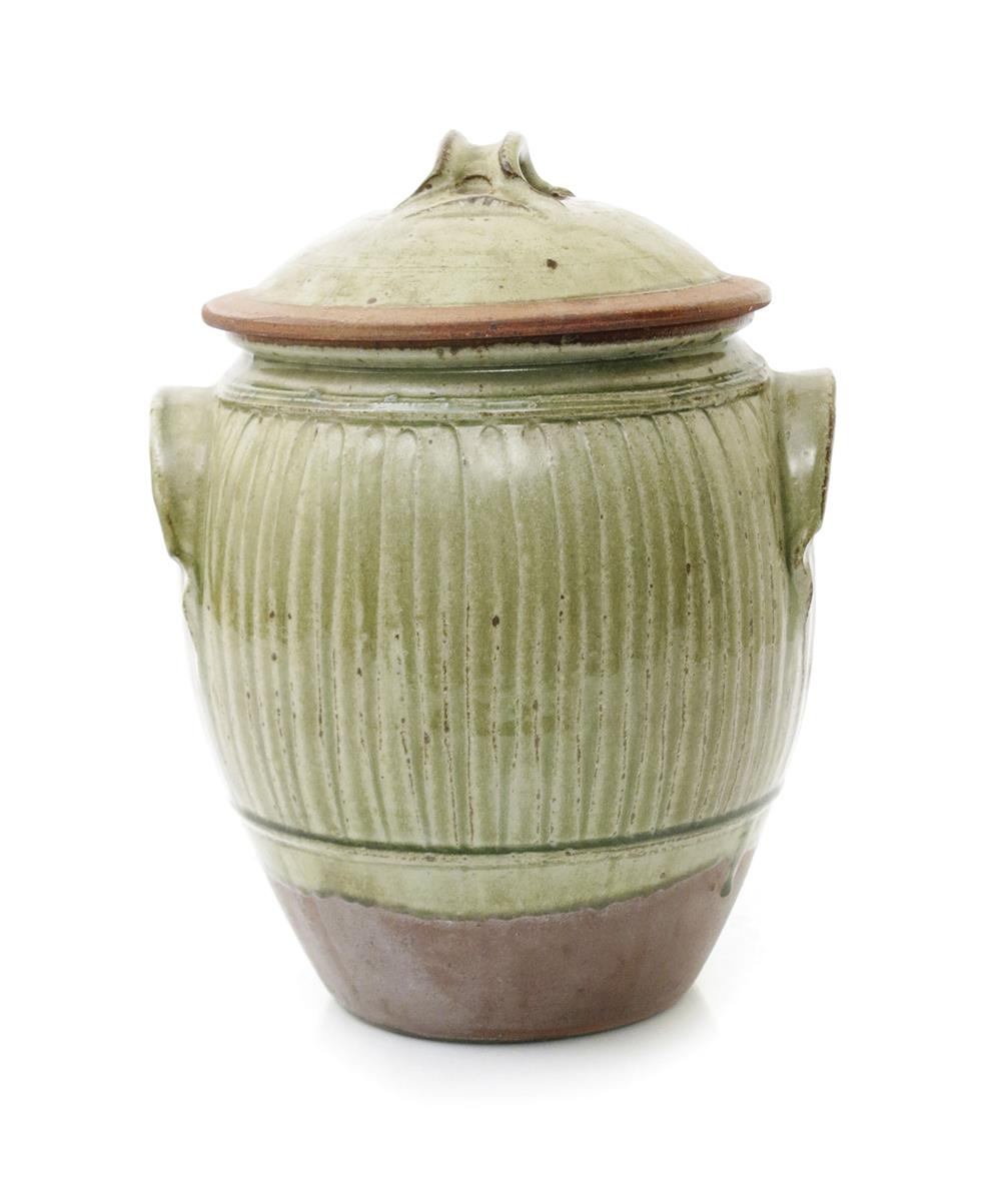 a large stoneware crock jar and cover, with twin lug handles, incised vertical decoration, covered to the base with a celadon-green ash glaze, unsigned, incised WF to base, applied paper label numbered 30, small flat chips to top rim of jar, 39cm. high, (2)