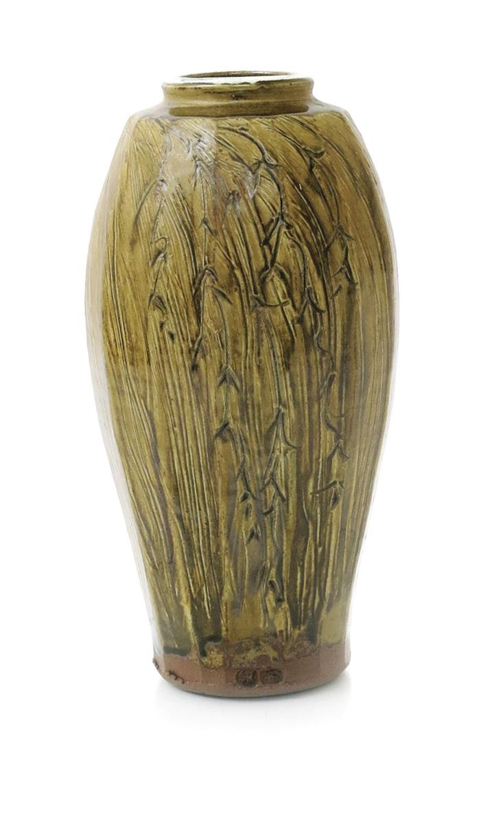 a Marston Pottery tall cut-sided stoneware vase, incised with bamboo stems, covered to the foot with an ash hakeme glaze, impressed seal marks, 36cm. high