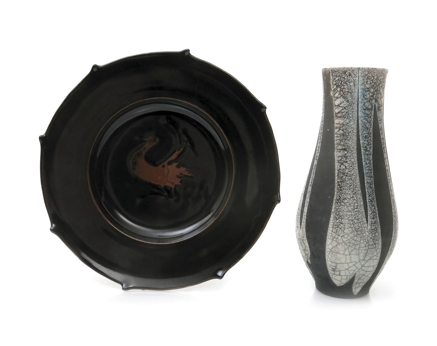 a raku pottery vase, slender, swollen cylindrical form, resist decorated with columns of white crackled glaze with light blue patches, over black, and a Tim Andrews plate with pulled rim, covered in a rich tenmoku glaze, decorated to the well with a bird, impressed seal mark, 27cm. high (2)